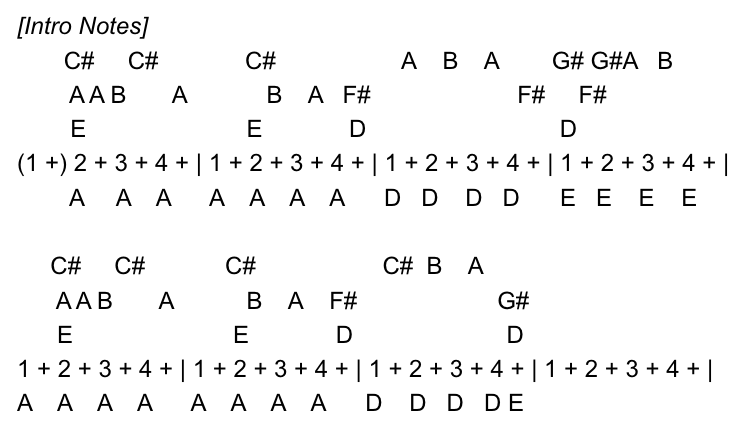 A | 3/8 D | A/C# | Bm7 | A | 2/4 E |